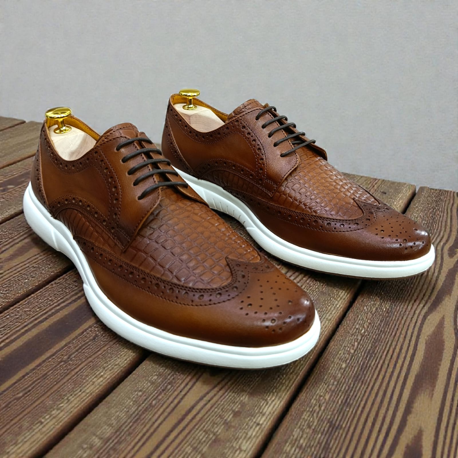 Zapato de carácter distinguido y diseño imponente, elaborado 100% en cuero natural con grabado tipo cocodrilo en tono miel, que aporta profundidad, lujo y personalidad. Su acabado artesanal resalta cada detalle del cuero, logrando un equilibrio perfecto entre elegancia clásica y estilo contemporáneo.