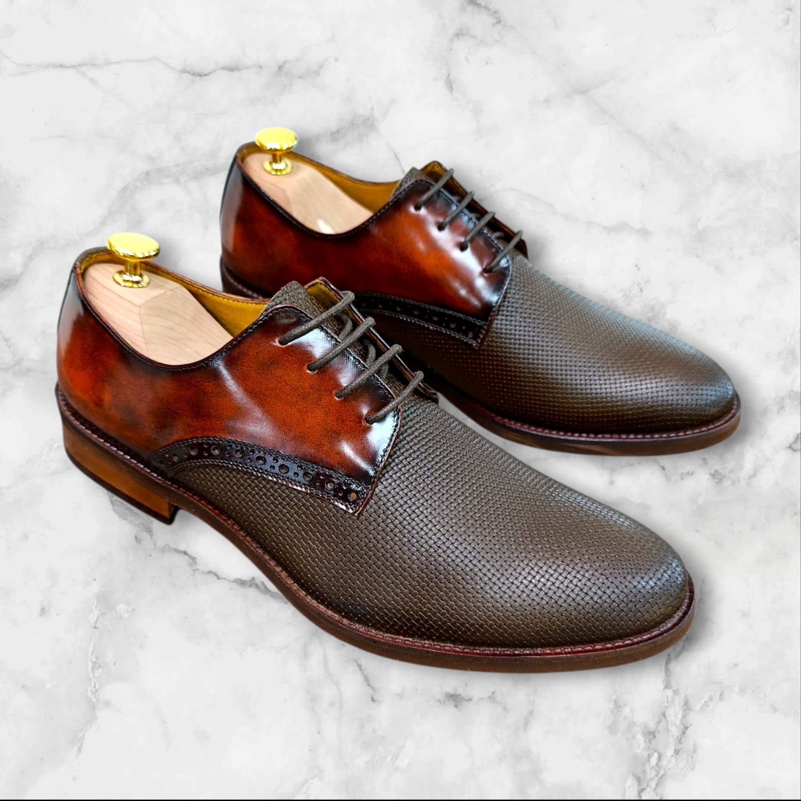 El Tintoreto Café Esterillado destaca por su acabado artesanal patina y su cuero esterillado, creando una textura profunda y elegante. Su tono café ofrece matices únicos trabajados completamente a mano.